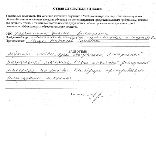 Спасибо Ирине и учебному центру БАЗИС за возможность расширить свои знания!