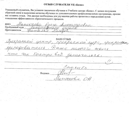 Курс понравился. Узнала много нового, приобрела новые знания и умения. Преподаватель выполняла все задания вместе с нами, что было правильным и наилучшим способом усвоения новой информации. Спасибо за обучение Ольга Николаевна.