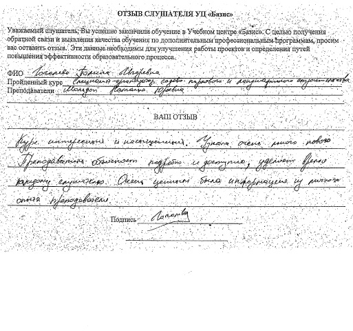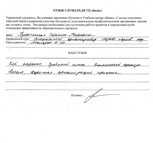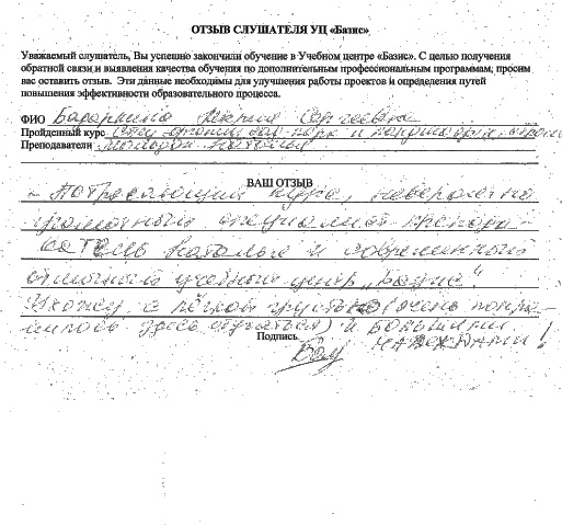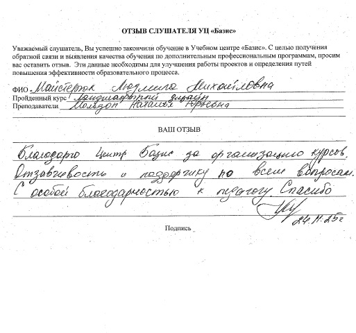 Благодарю центр Базис за организацию курсов. Отзывчивость и поддержку по всем вопросам. С особой благодарностью к педагогу. Спасибо.